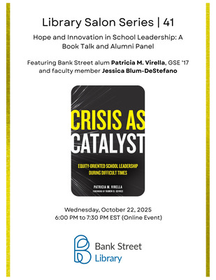 Library Salon #41 features a conversation between Bank Street alum Patricia M. Virella, GSE '17 and faculty member Jessica Blum-DeStefano on "Crisis as Catalyst," exploring how challenges can drive transformative leadership within schools and communities. The talk will draw on stories from the book and the lived experiences of Bank Street’s Principal's Institute alumni, each of whom has led teams through moments of crisis to foster equity, hope, and authentic change.